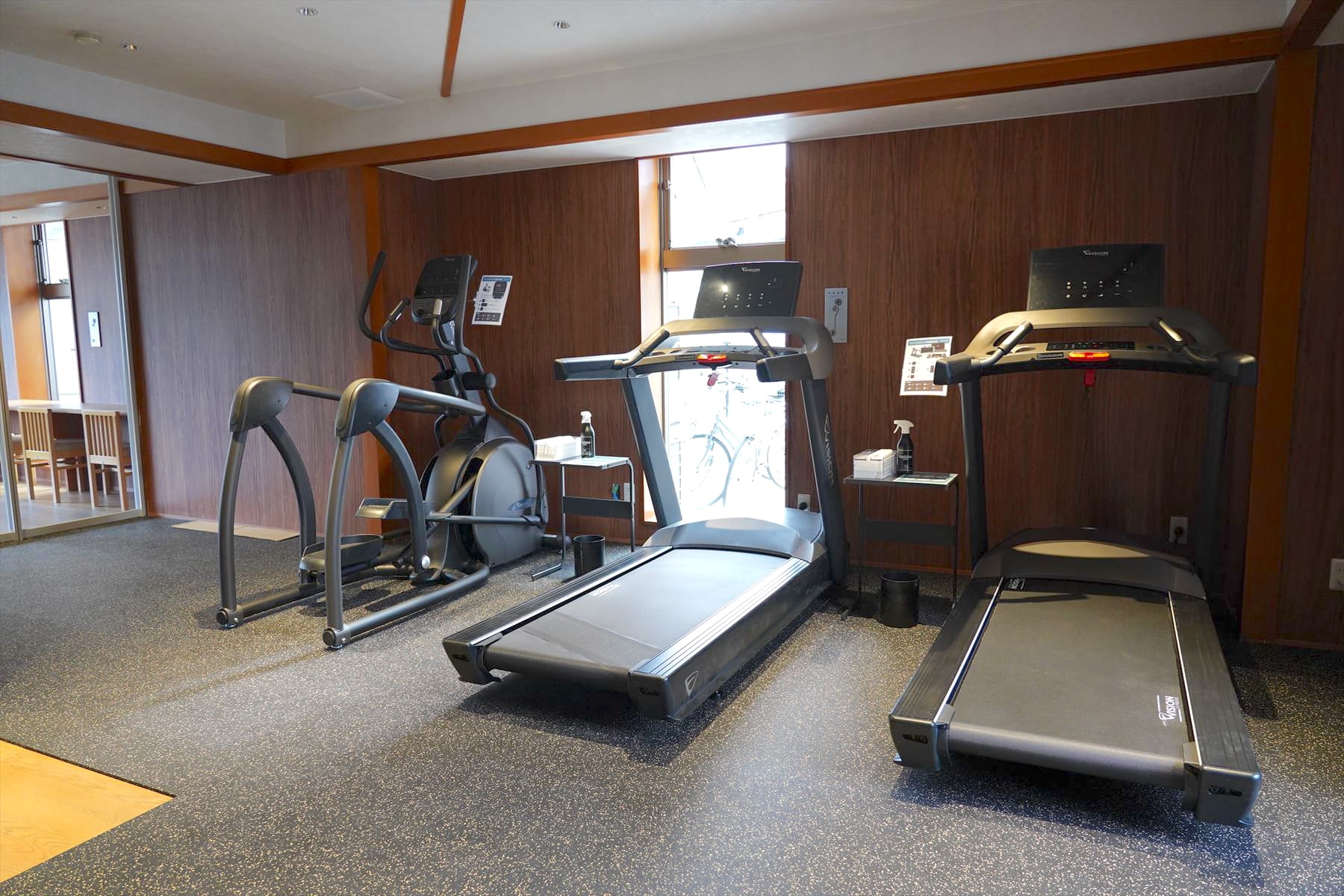 1FフィットネスジムコーナーではVision社製の本格的トレーニングマシン(トレッドミル、アップライトバイク、サスペンションエリプティカル)を設置。長期滞在での運動不足解消・健康管理に、プライベートジムの様に24時間無料でご利用いただけます。