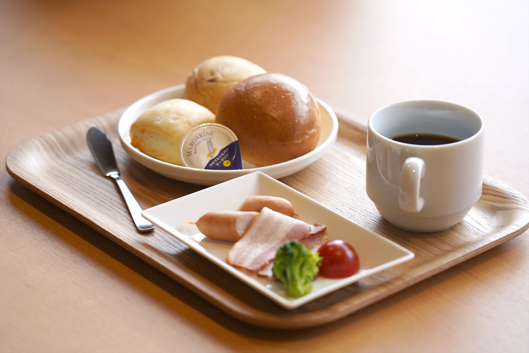 おにぎり&味噌汁、パン&コーヒーなど、簡単ではありますが無料にて朝食を提供しています。
